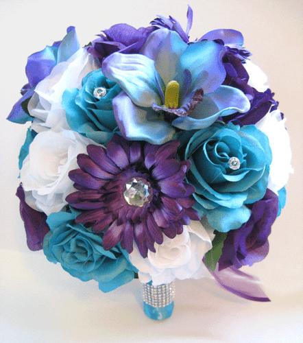 Wedding Bouquet 17 Piece Bridal Silk Flowers Purple Daisy Turquoise Blue Orchid Ebay